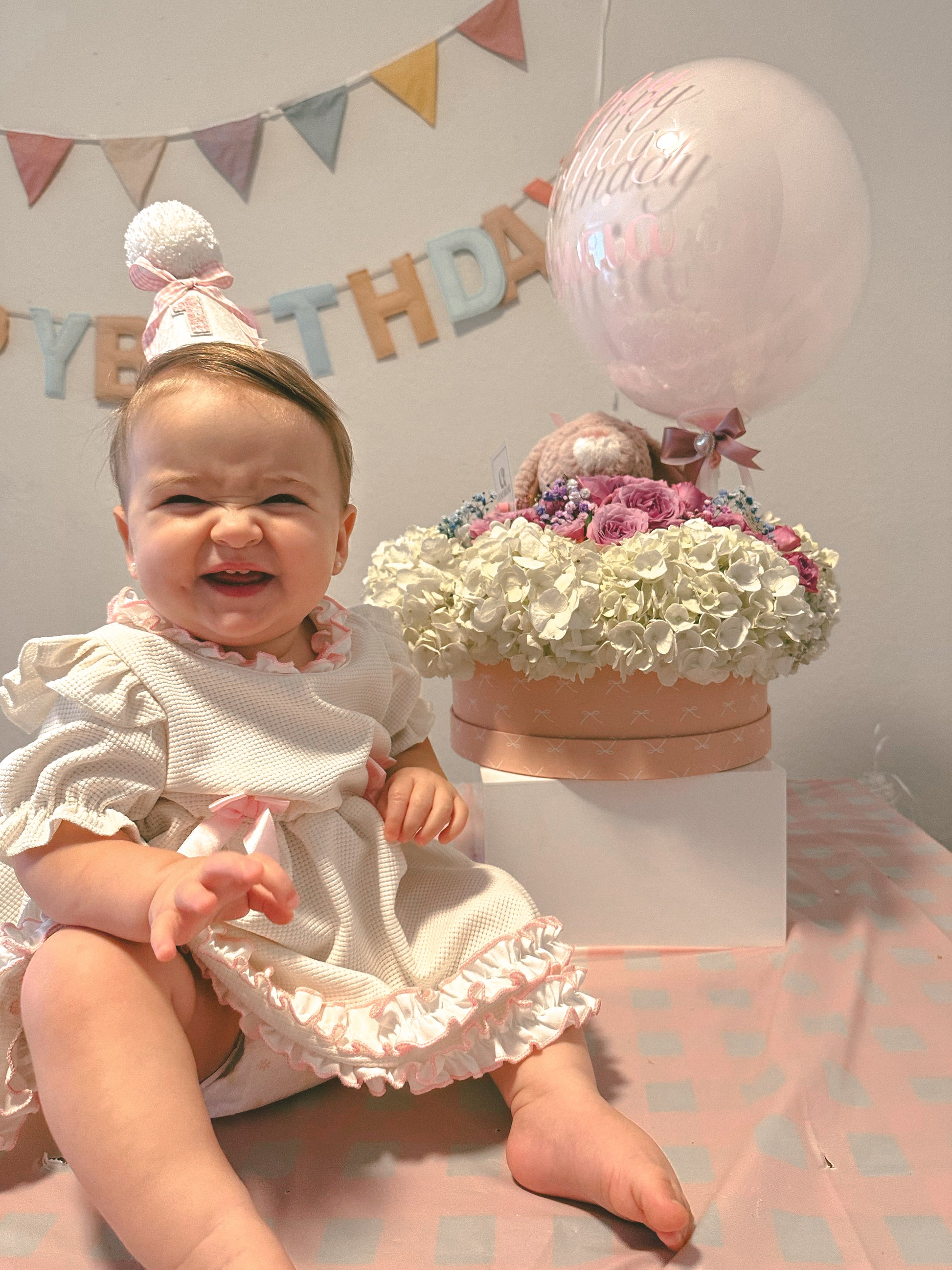 Celebra los momentos más especiales con nuestra Luxury Birthday Bloom Box – un hermoso arreglo con hortensias blancas, delicadas mini rosas y detalles coloridos de gypso (velo de novia). Este exclusivo regalo incluye un globo burbuja personalizado y un peluche suave, ideal para cumpleaños y ocasiones inolvidables.