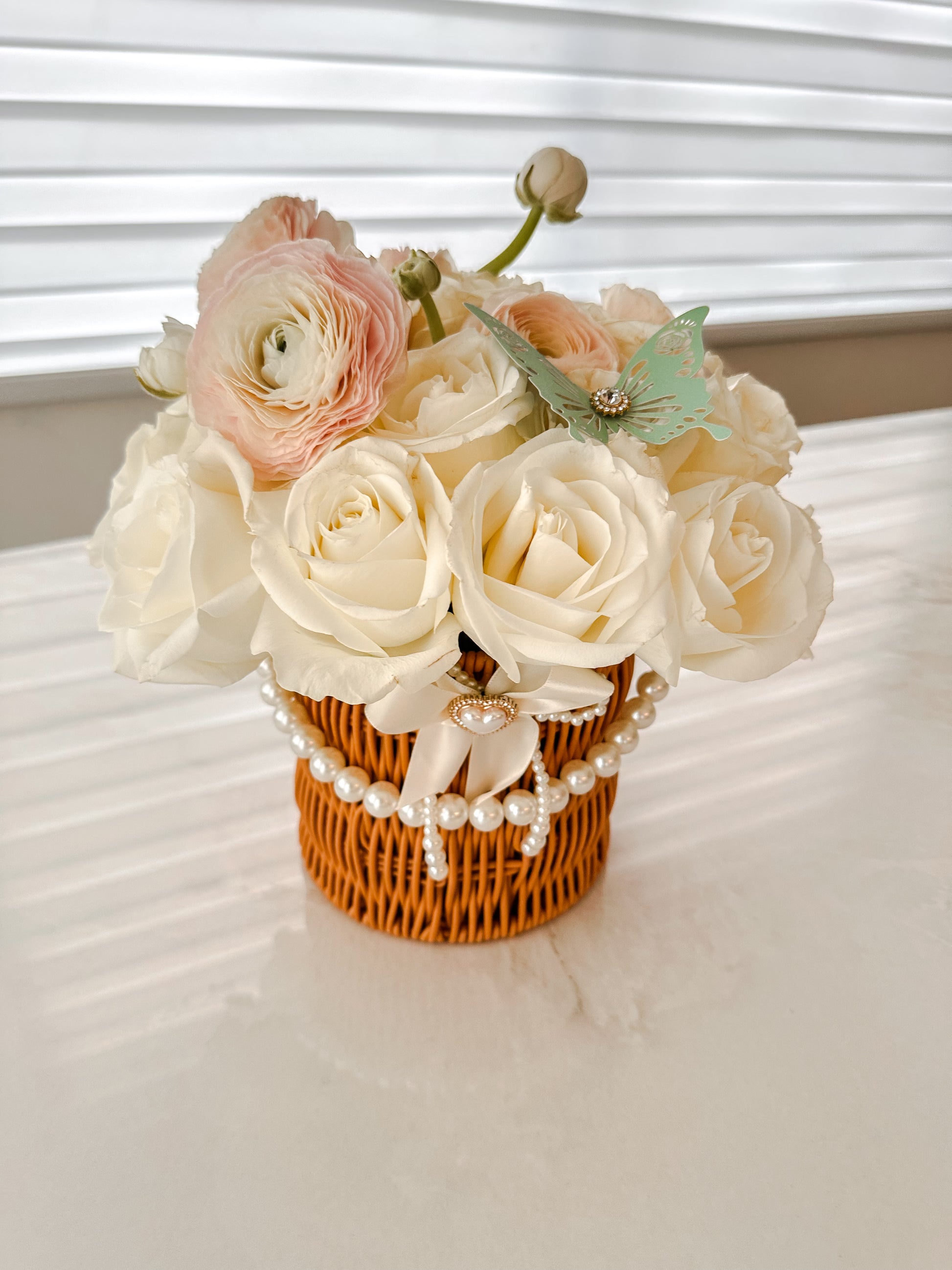 A charming arrangement of Ranunculus and premium roses in a pearl-accented basket – the perfect touch of elegance for someone truly special.