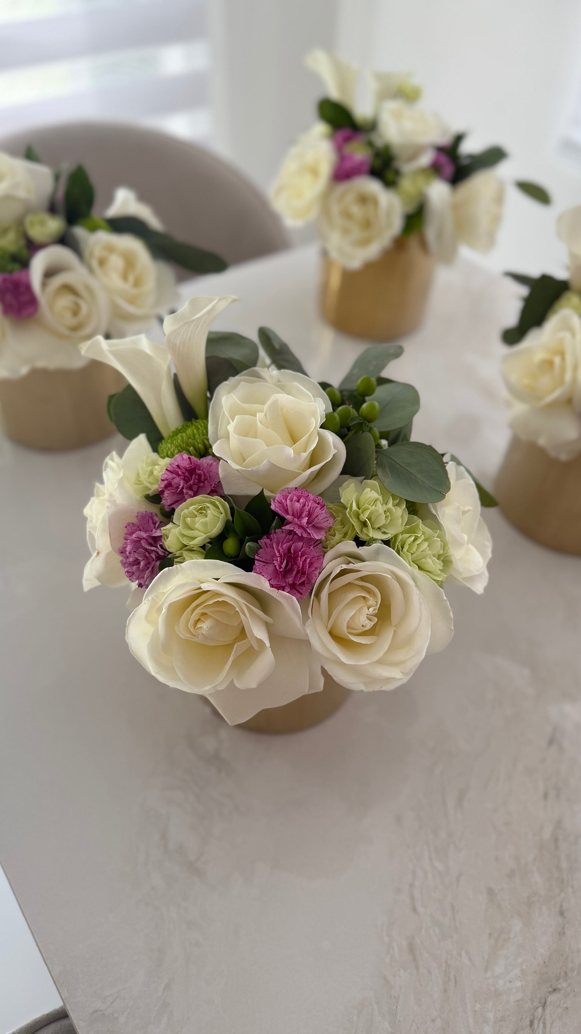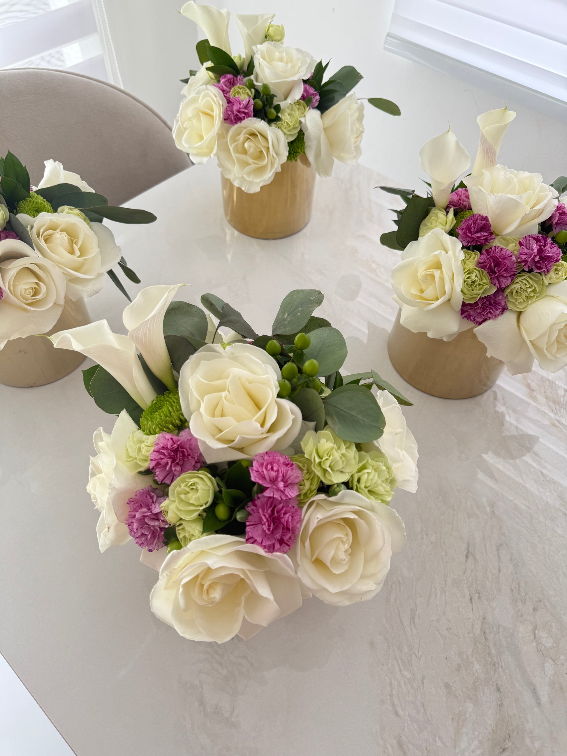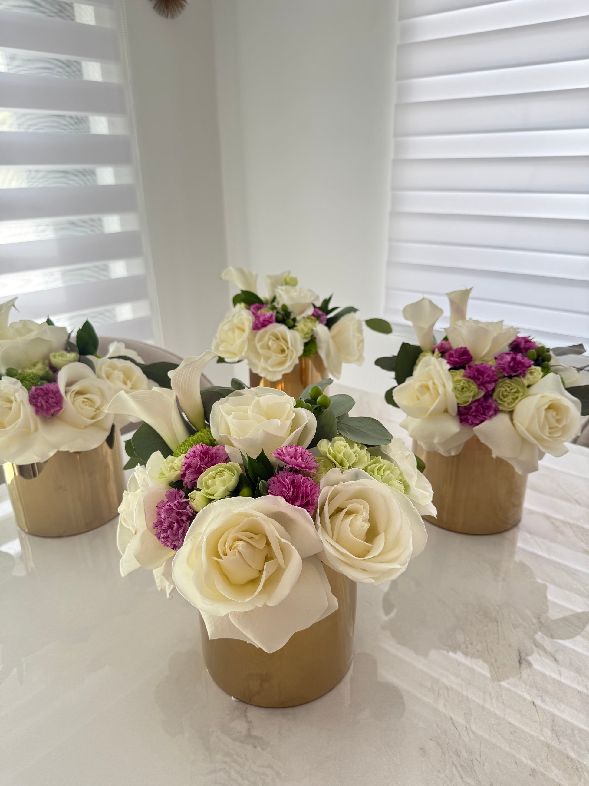 Elevate your celebration with the Table floral arrangement — a stunning combination of soft tulips and two-toned roses, beautifully arranged on a luxurious base available in gold, silver, or clear (based on availability).