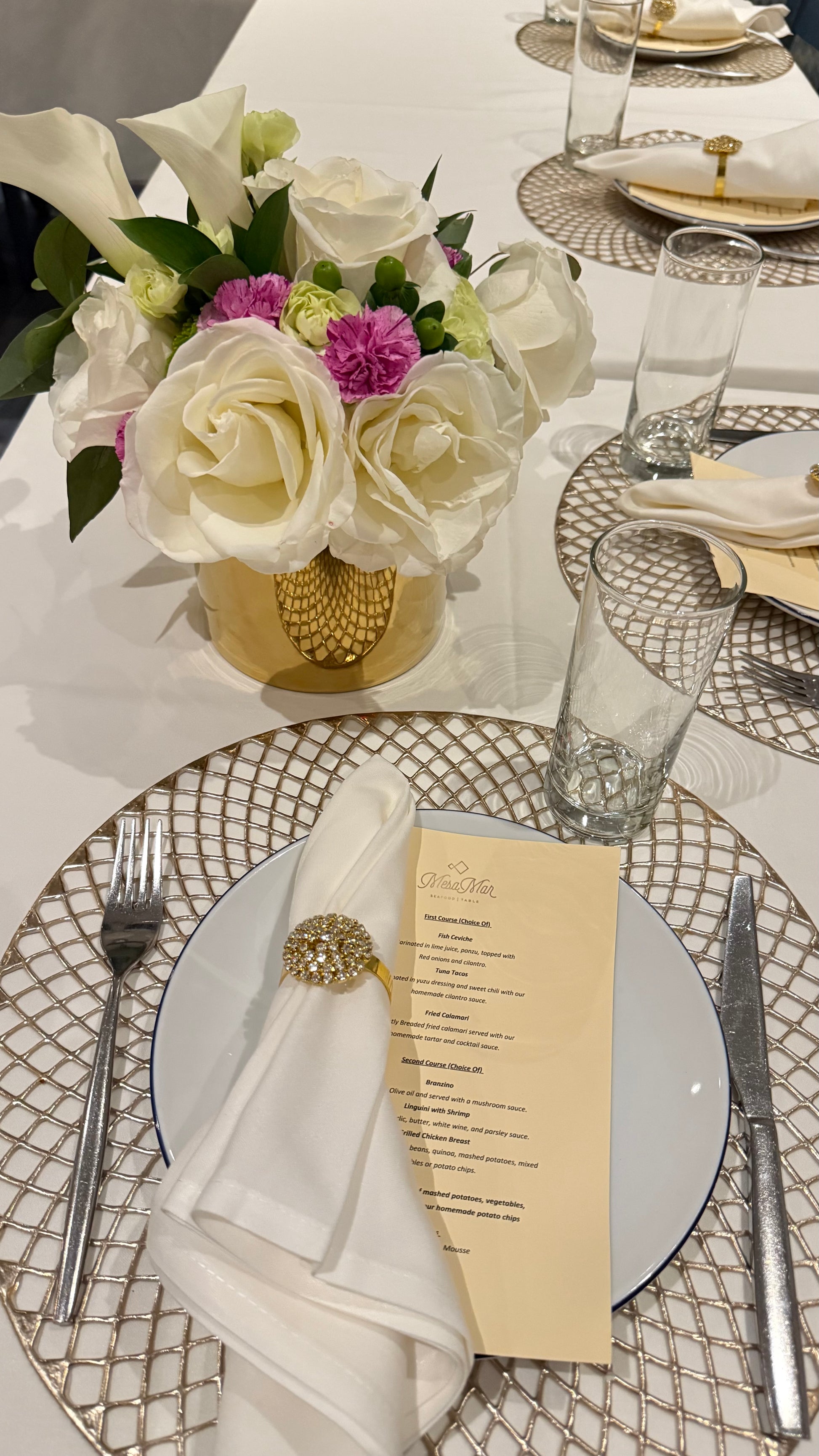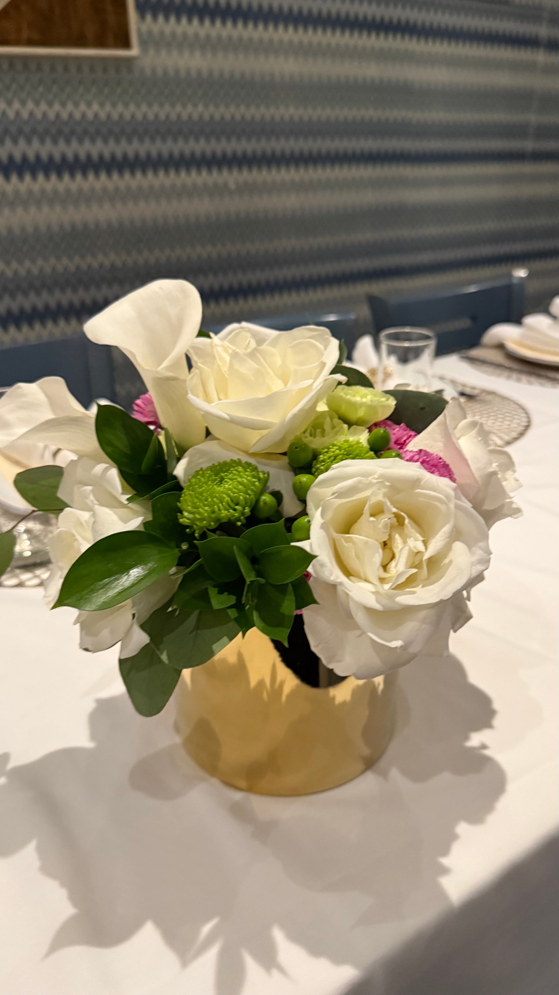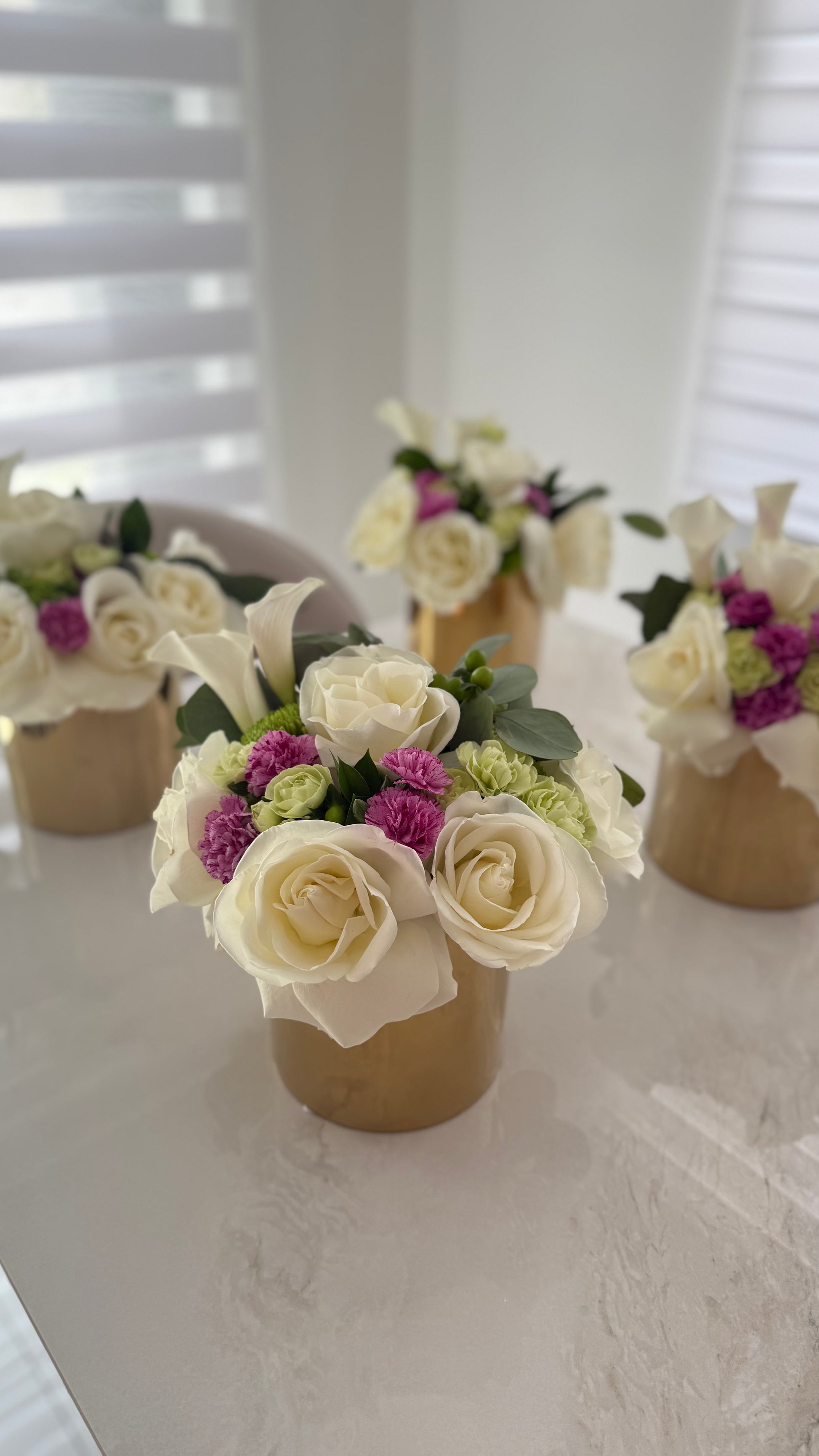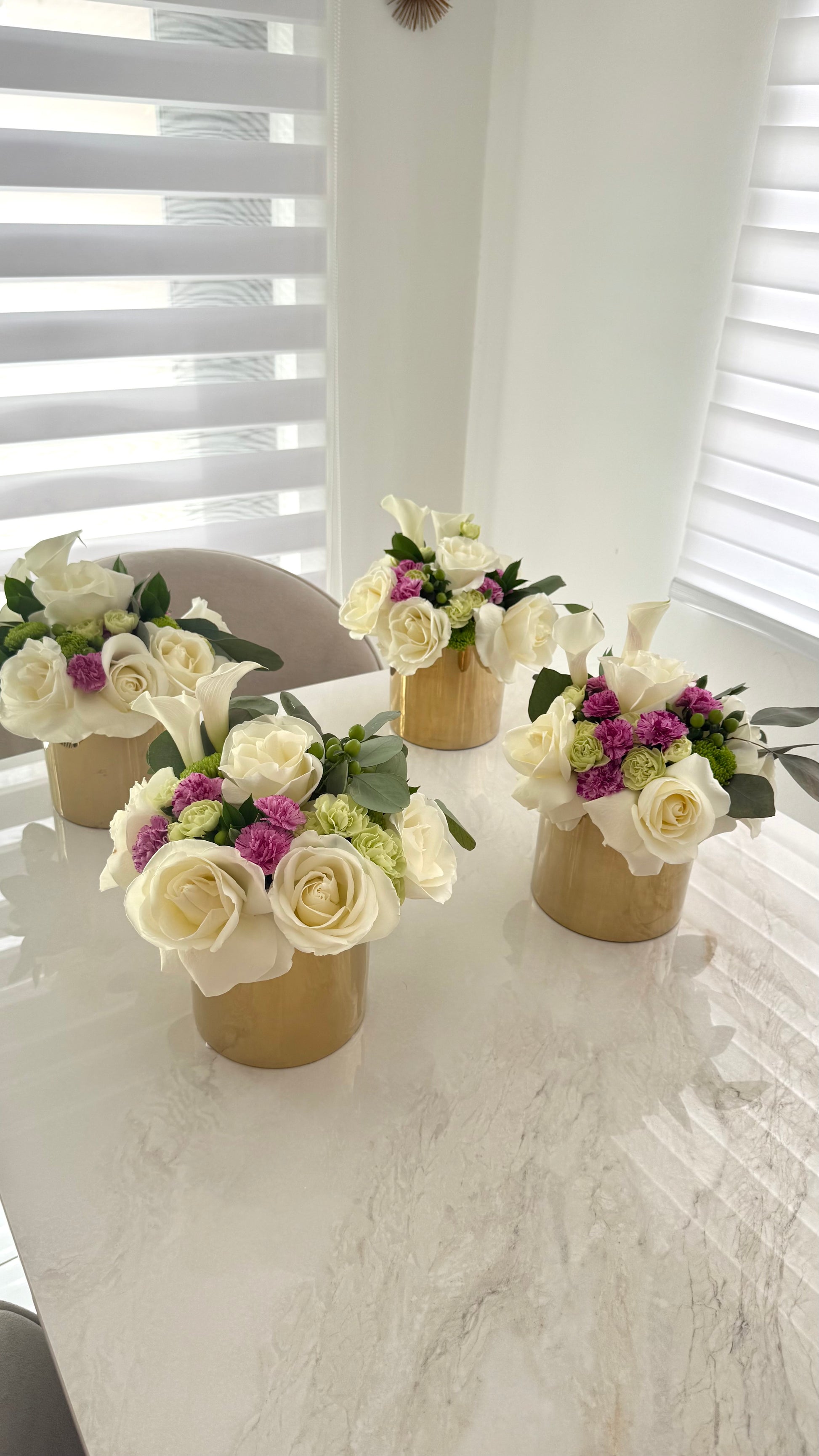 Elevate your celebration with the Table floral arrangement — a stunning combination of soft tulips and two-toned roses, beautifully arranged on a luxurious base available in gold, silver, or clear (based on availability).